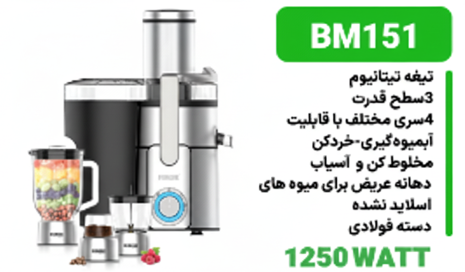 آبمیوه گیری 4 کاره بیسمارک مدل BM151 | تیغه تیتانیوم - 1250 وات + گارانتی 24 ماهه کارت طلایی تعویض