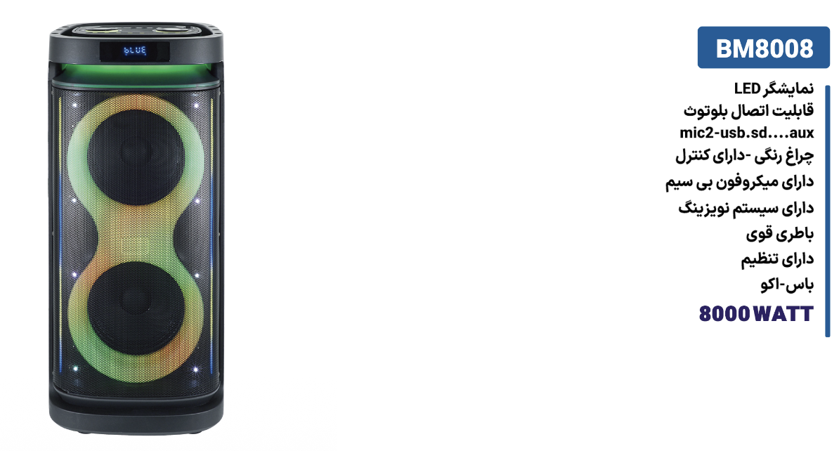جواب 2: مدت زمان شارژدهی باتری اسپیکر BM8008 بسته به میزان صدا و نوع محتوای پخش شده، بین 4 تا 6 ساعت متغیر است. - سوال 3: آیا میتوان از این اسپیکر برای مکالمه تلفنی استفاده کرد؟