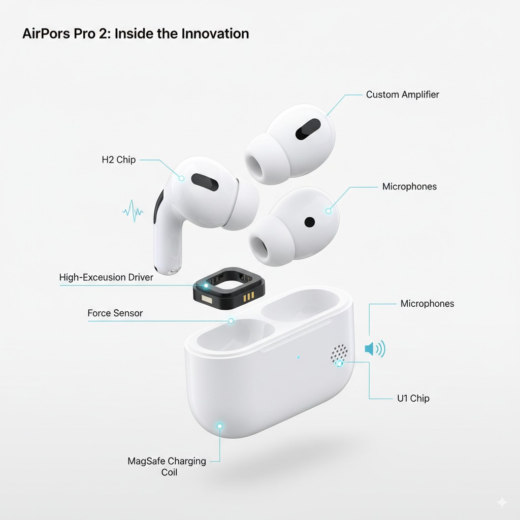 - تراشه H2: قلب تپنده ایرپاد پرو 2، که پردازشهای صوتی پیچیده را با سرعت و کارایی بالا انجام میدهد. این تراشه مسئول بهبود چشمگیر حذف نویز فعال، پردازش صدای فضایی و حالت شفافیت تطبیقی است.