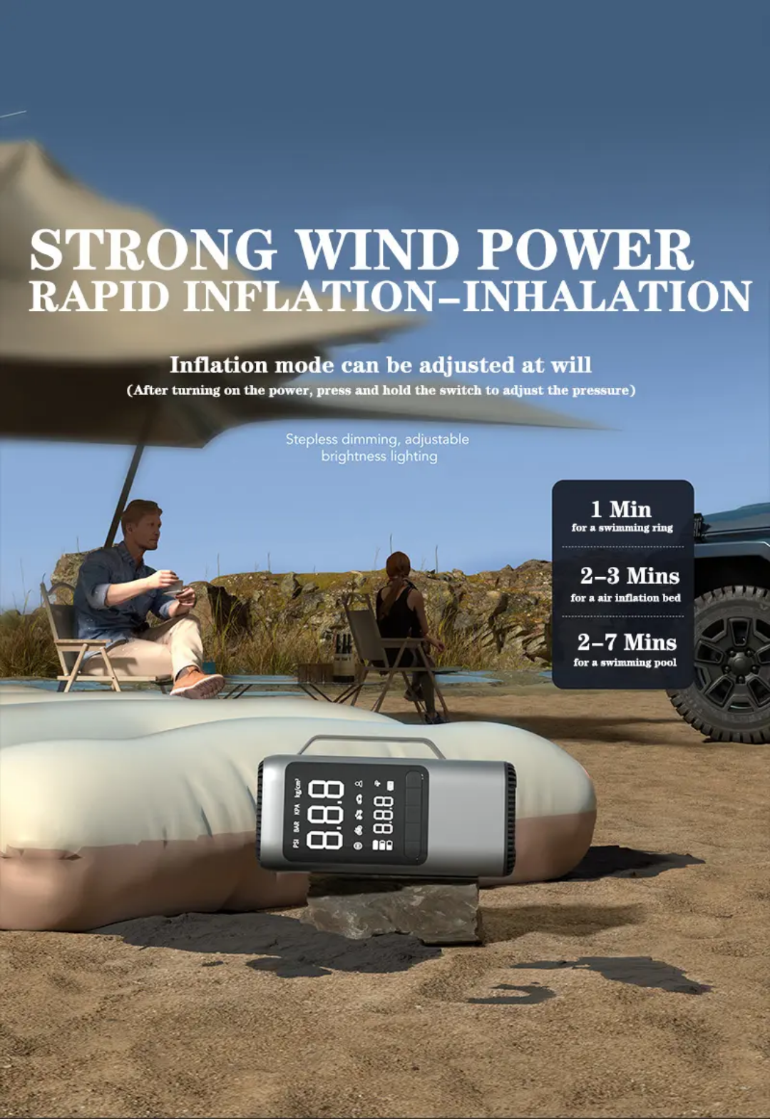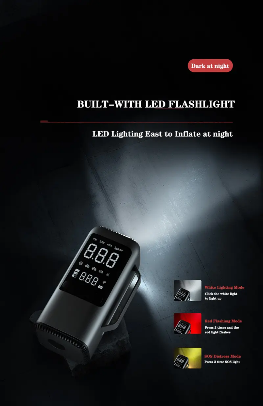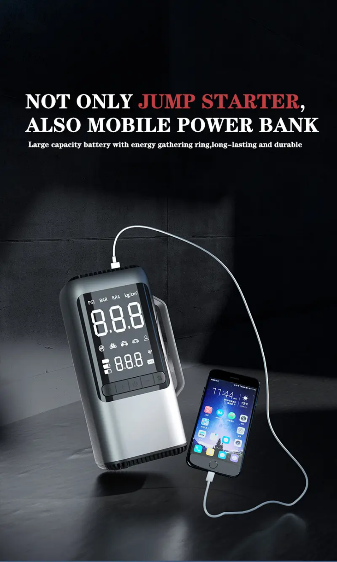 - ابزاری ۴در۱: استارت اضطراری، پمپ باد دقیق، پاوربانک و چراغ قوی